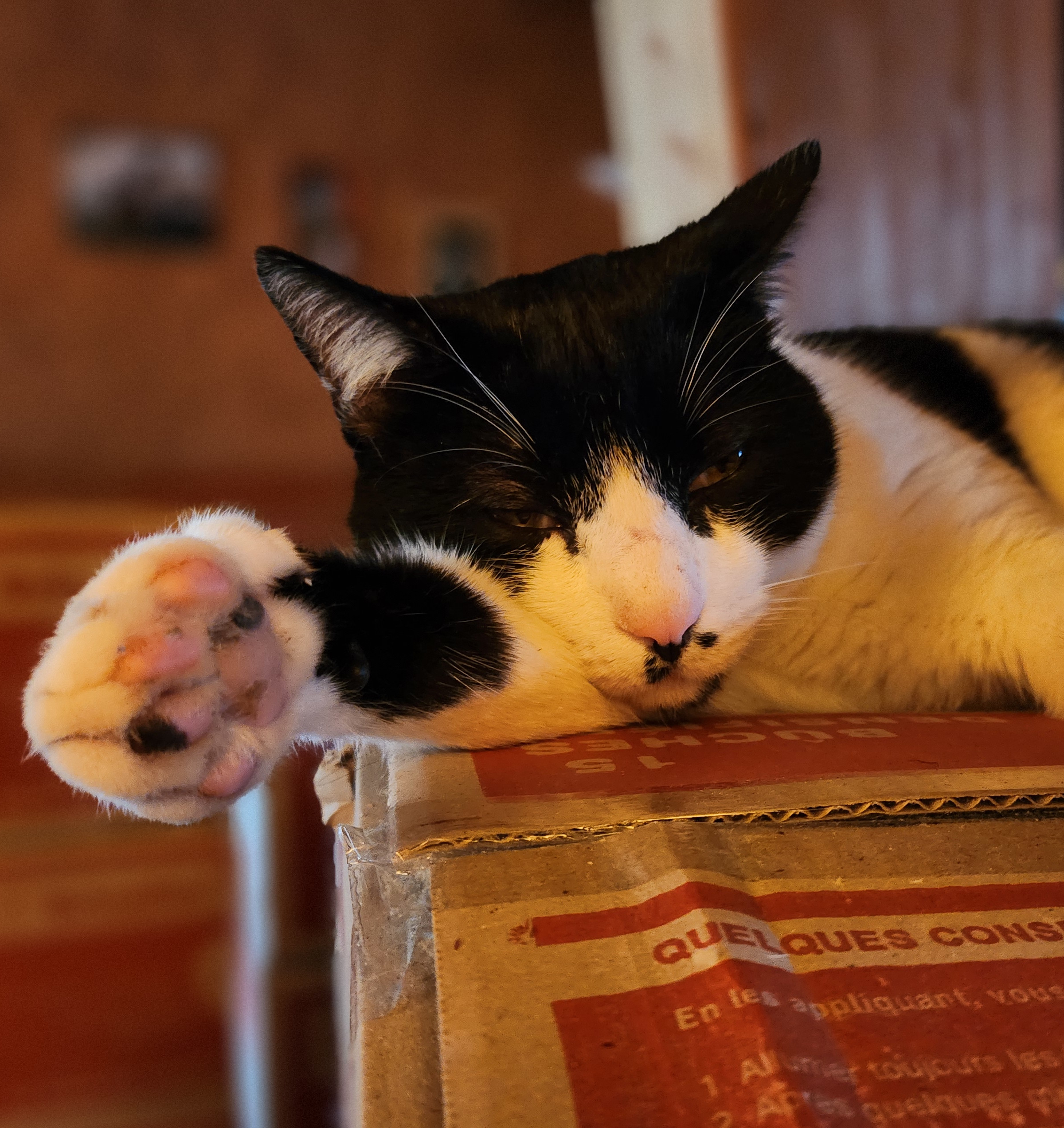 Type européen noir et blanc, joueur, chat d’extérieur. Aime beaucoup les caresses, même s’il a tendance à mordiller.